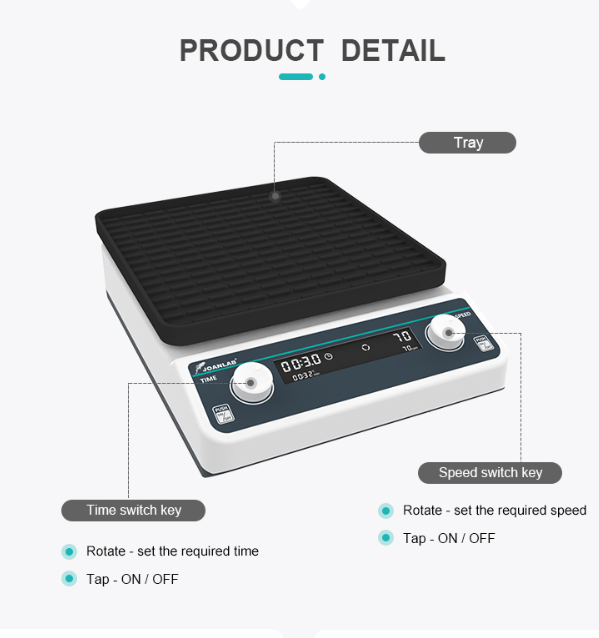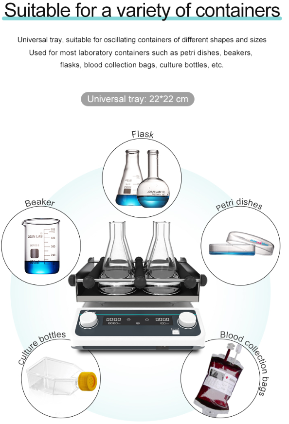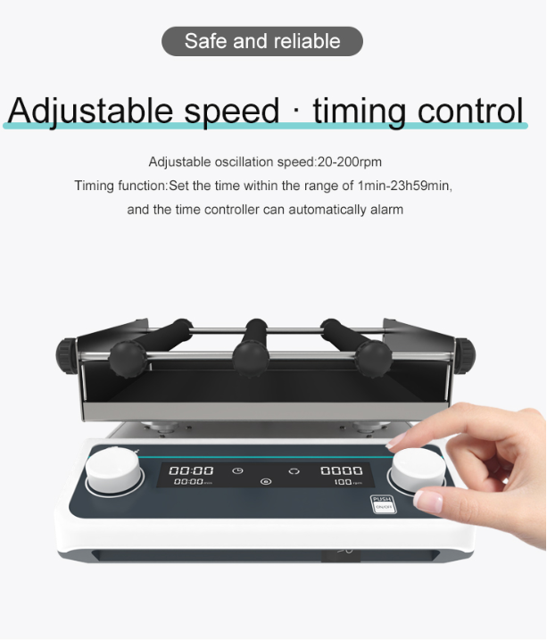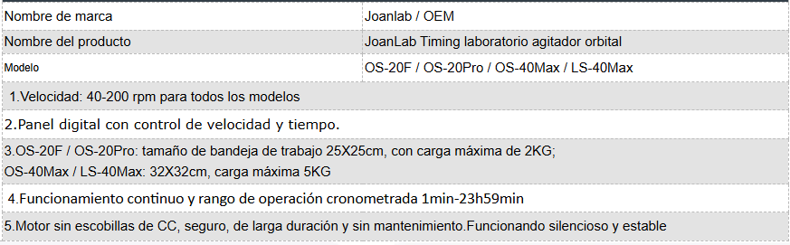 Marca: JOANLAB | Modelo: OS-20F Velocidad: 40-200 rpm para todos los modelos Panel digital con control de velocidad y tiempo Superficie de trabajo: 25 x 25 cm, con carga máxima de 2 kg. Funcionamiento continuo y temporizado