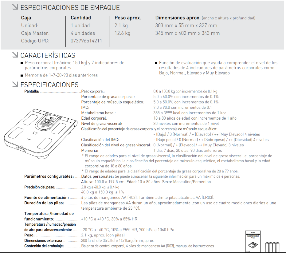 Marca: OMRON | Modelo: HBF-514C La balanza con Sensor de Cuerpo Completo te brinda la medición de parámetros corporales mas precisa, ya que cuenta con 7 indicadores de parámetros corporales.