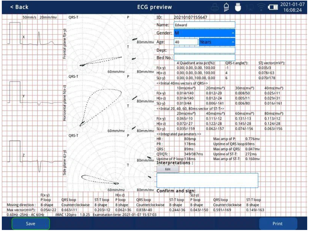 ● Las funciones TVCG y VCG son opcionales. La VCG es la base de la forma de onda del ECG. Tiene un rendimiento significativo en el diagnóstico de infarto de miocardio, bloqueo de rama e hipertrofia ventricular.